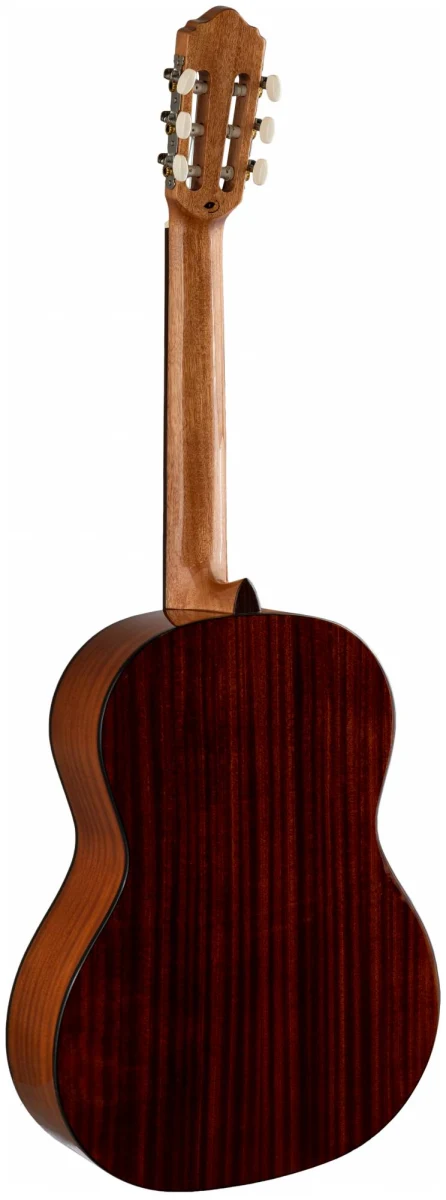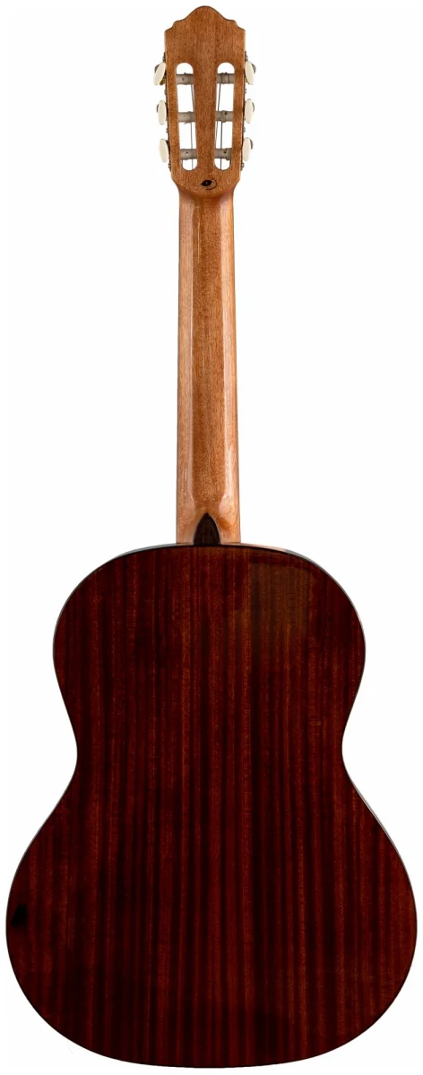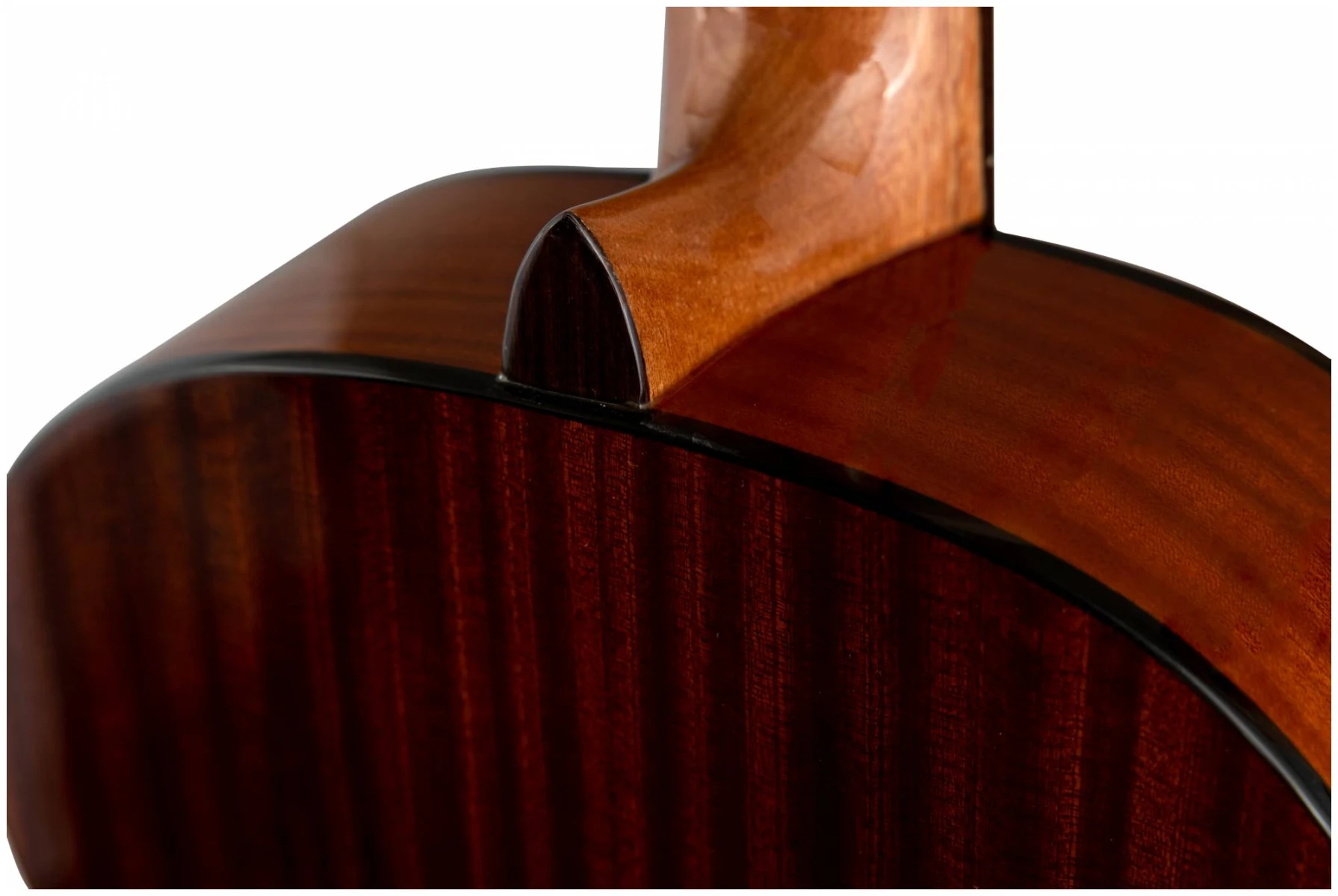 Flight C-120 SB PACK оснащён верхней декой из ели, обеспечивающей чистое и яркое звучание, а нижняя дека и обечайки выполнены из сапеле, что придаёт тембру глубину и мягкость. Кабукалли, использованный для накладки на гриф толщиной около 6 мм, приятен на ощупь и отличается высокой надёжностью. Гитара комплектуется нейлоновыми струнами, оптимально установленными на высоте 4 мм для комфортной игры, и оснащена плавной, точной колковой механикой для надёжного строя. Особое внимание заслуживает выпуклая форма нижней деки, способствующая насыщенному и объёмному резонированию, а также тонкий высококачественный слой лака, сохраняющий выразительный внешний вид инструмента. Стильный цвет санберст и глянцевая отделка подчёркивают современный дизайн гитары.