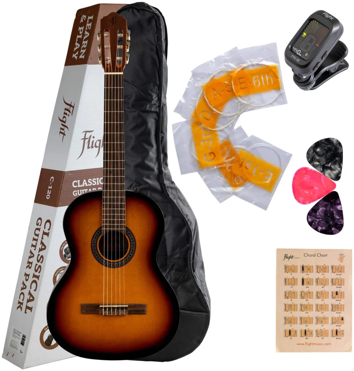 Классическая гитара Flight C-120 SB PACK с аксессуарами – идеальный комплект для начинающих и учеников.
