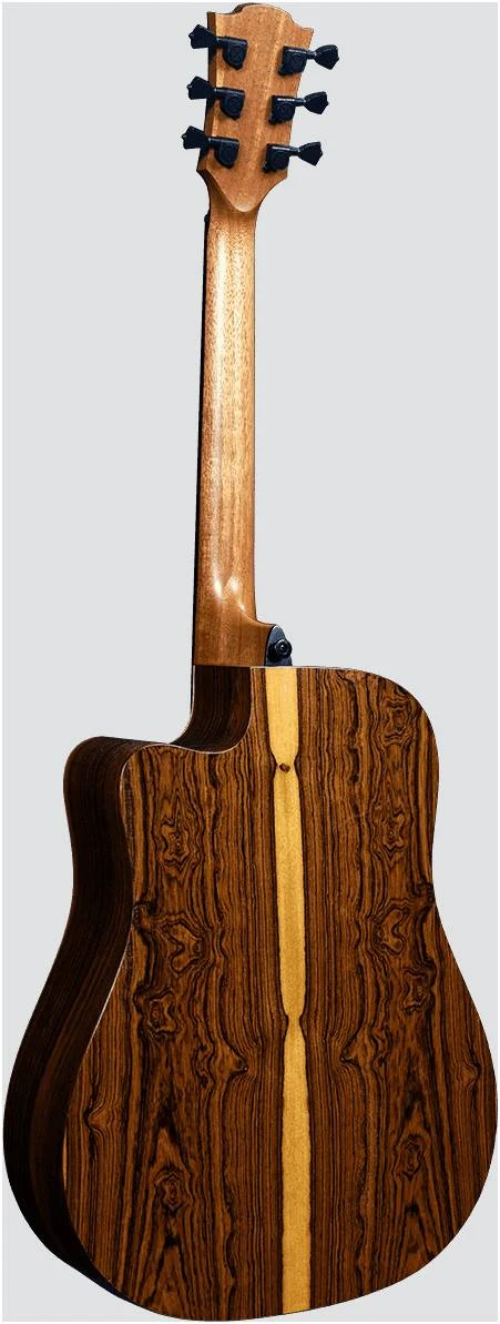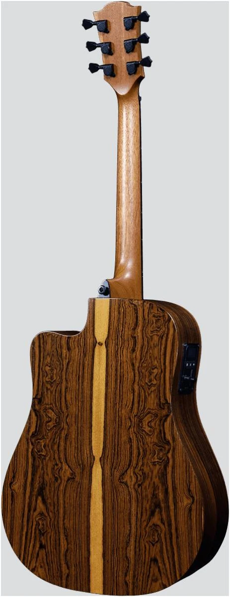 Редкие экзотические материалы, используемые при создании гитар THV30 DCE - массив ситхинской ели «медвежий коготь» и узорчатая древесина бокоте – придают гитаре индивидуальный облик и отражаются в необычном звучании инструмента. Каждая деревянная деталь инструмента проходит тщательный отбор на соответствие эстетическим и звуковым критериям. Это невероятно отзывчивый инструмент с впечатляющим сустейном и богатыми насыщенными средними частотами.