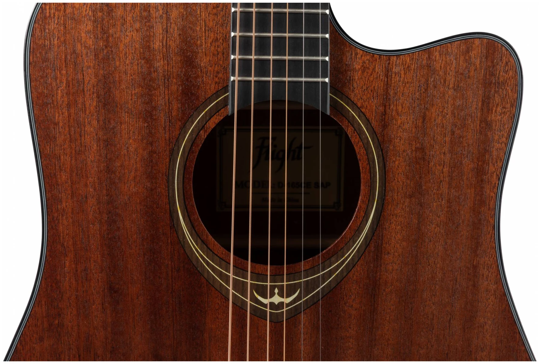 Электроакустическая гитара FLIGHT D-165CE SAP – имеет верхнюю деку из шпона сапеле, но не стоит относиться к этому предвзято – шпон гораздо менее капризен и подвержен влиянию влаги и температуры, что не маловажно в условиях сухового российского климата, особенно в отопительный сезон.