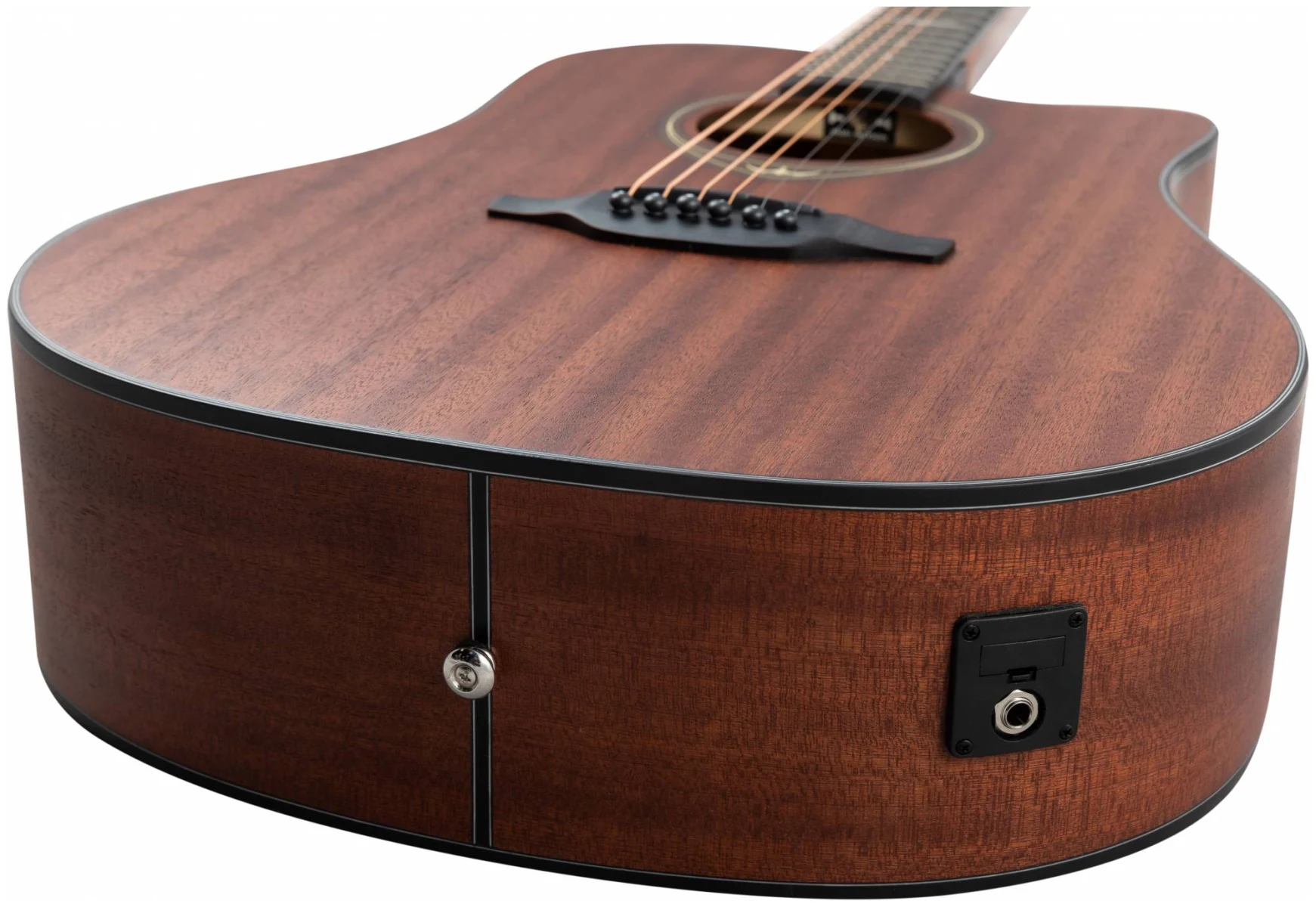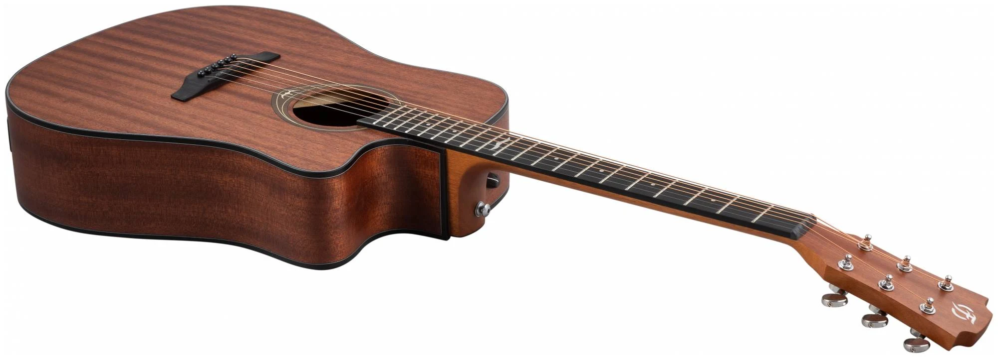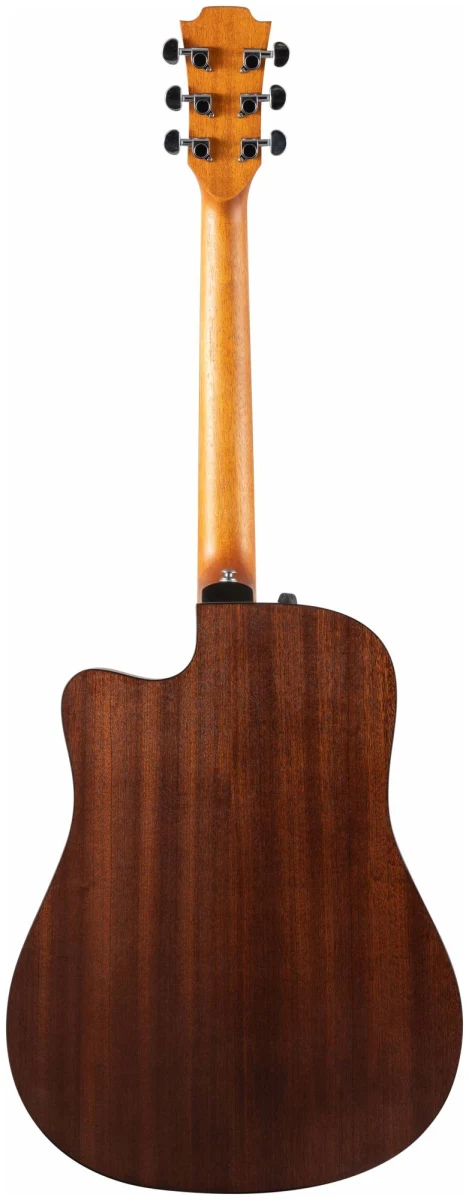 Верхняя и нижняя дека гитары изготовлены из сапеле, которое наполняет звук своей теплотой и певучестью. Натуральный цвет инструмента с прозрачным матовым лаком хорошо передает естественную красоту дерева, гармонично сочетаясь с любой окружающей обстановкой.