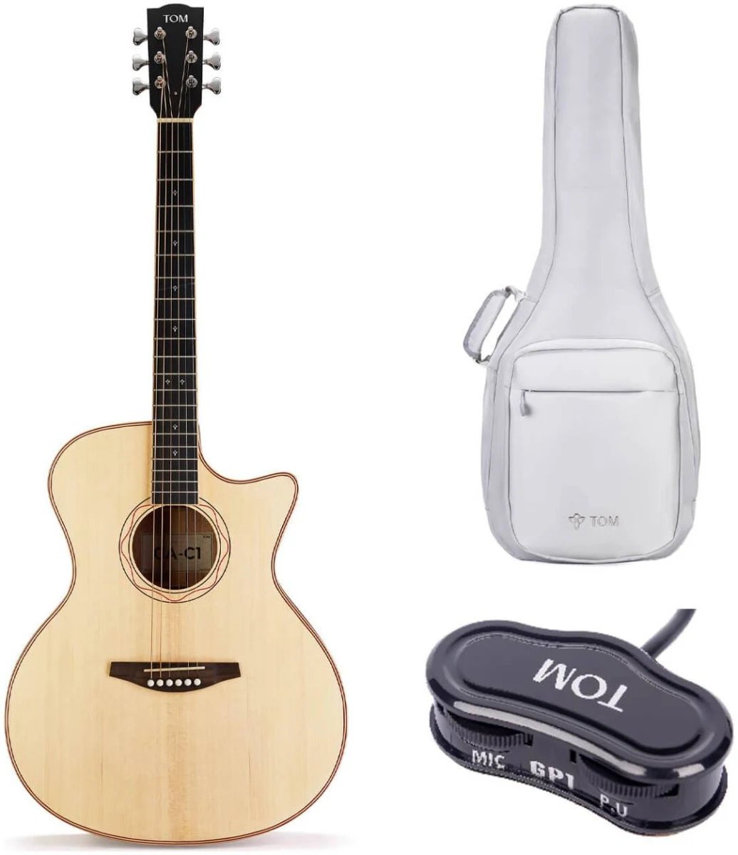 TOM GA-C1E электроакустическая гитара в корпусе гранд аудиториум с вырезом. Верхняя дека из массива ели и корпус из красного дерева. В комплекте качественный чехол.