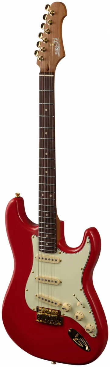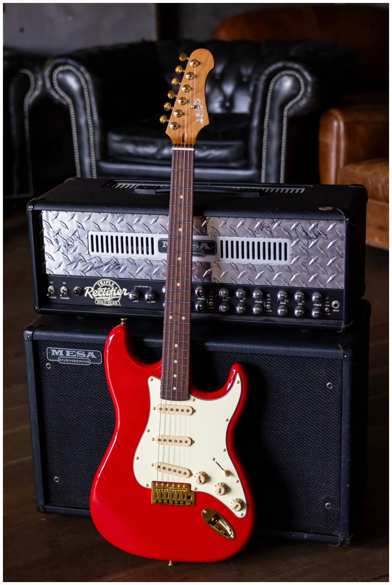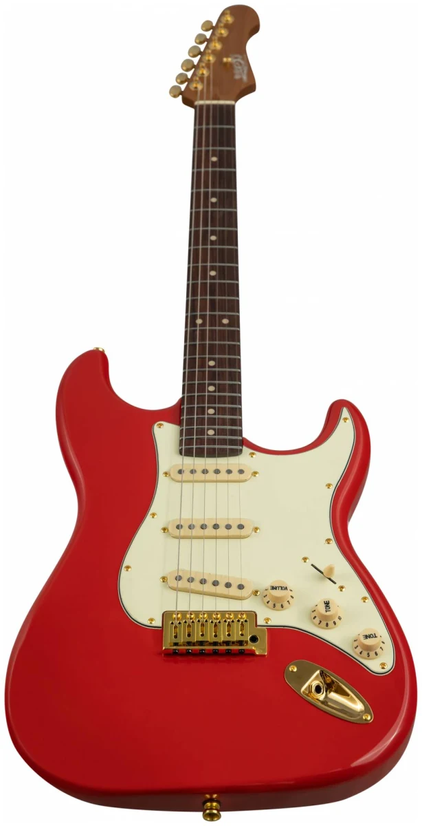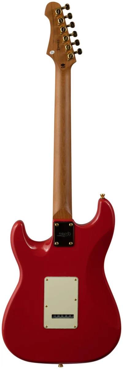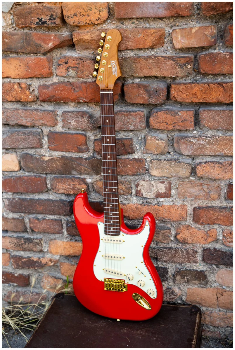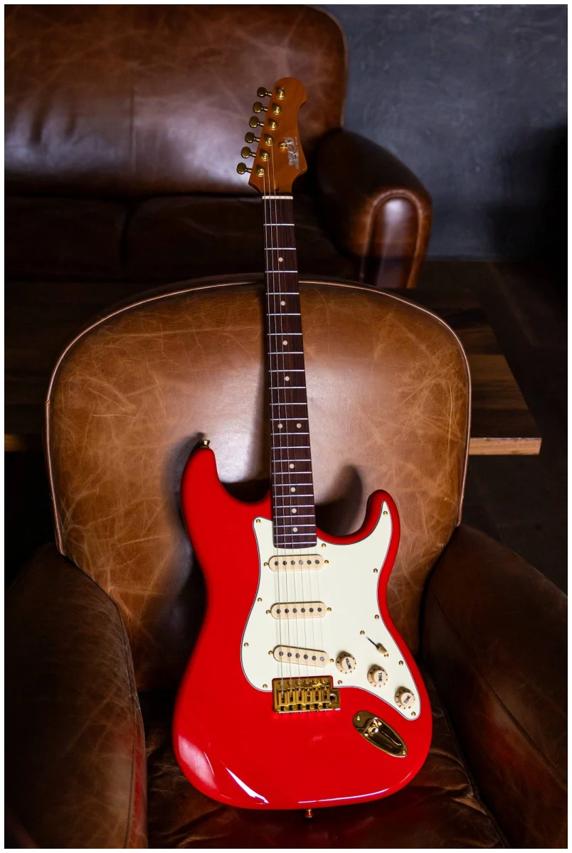 Накладка на гриф выполнена из палисандра с винтажными маркерами Clay Dots, локовые колки, золотая фурнитура и тремоло, звукосниматели SSS Alnico кремового цвета, накладка и ручки управления кремового цвета – в JET JS-380 RD G все продумано до мелочей.