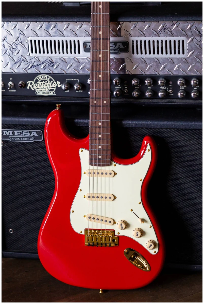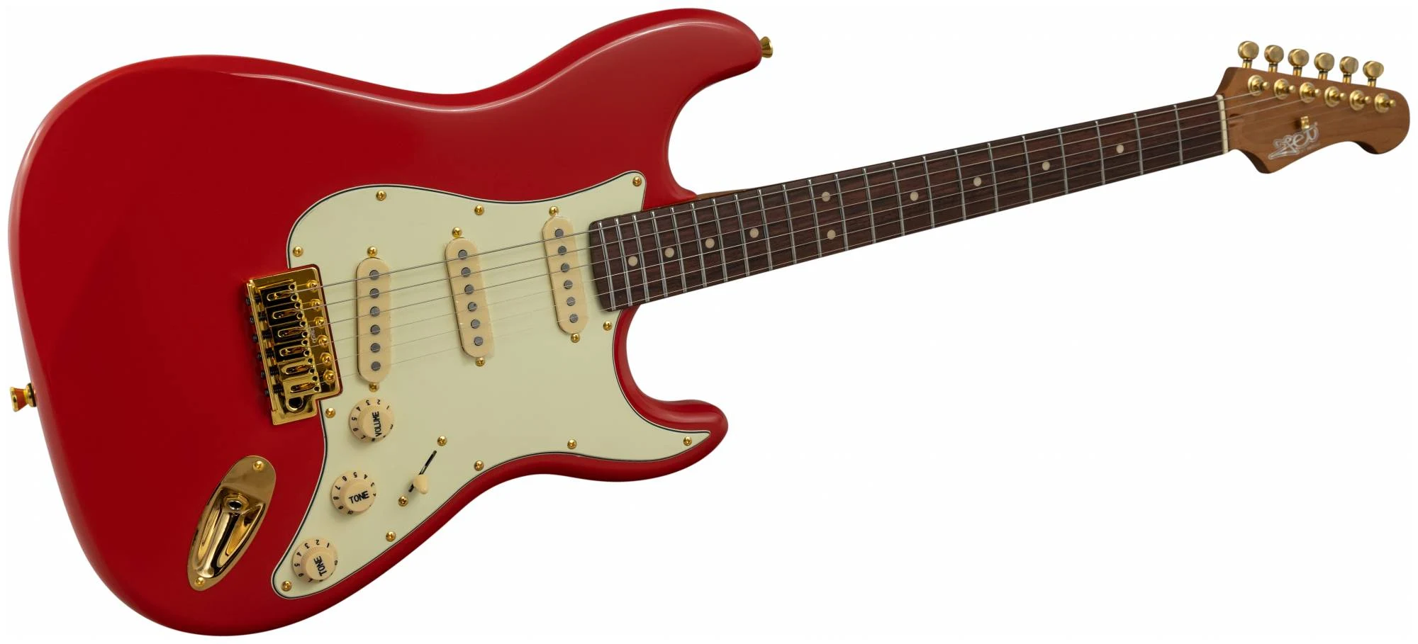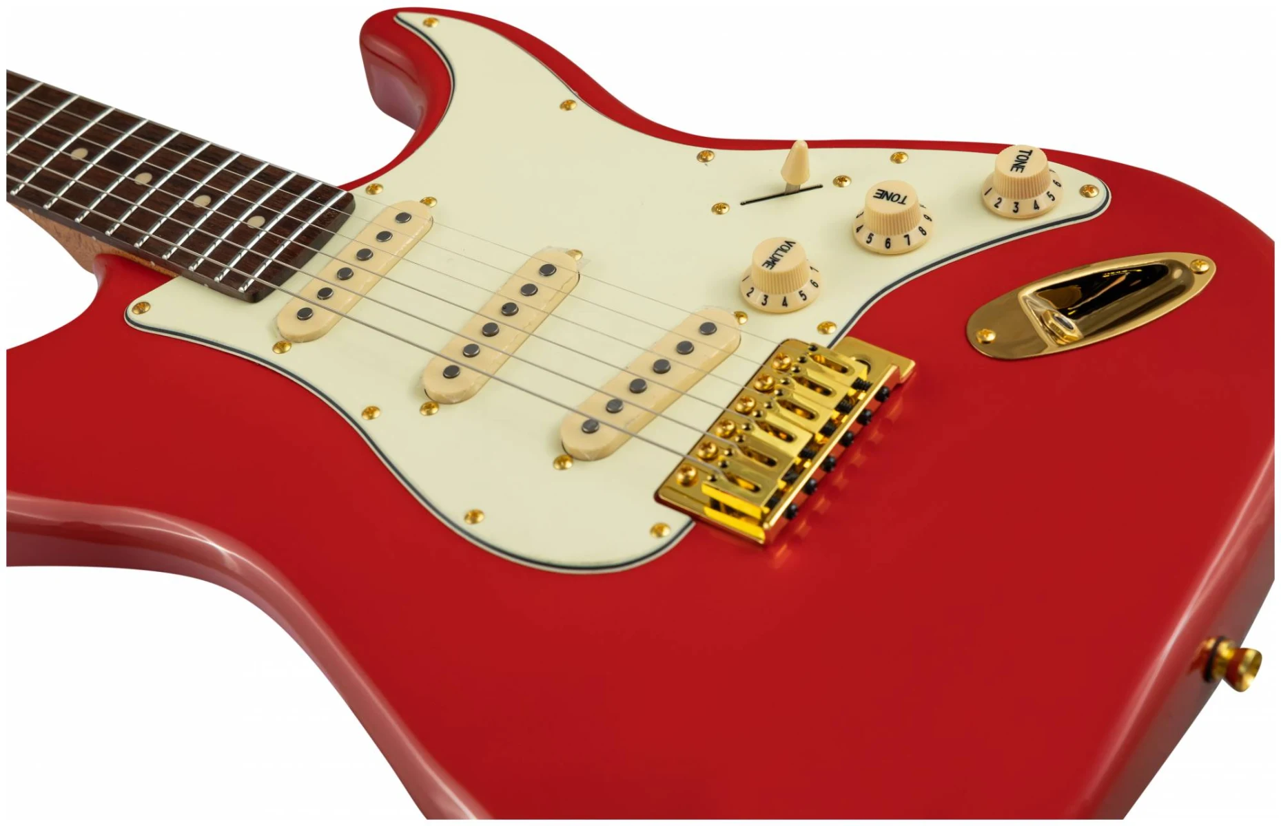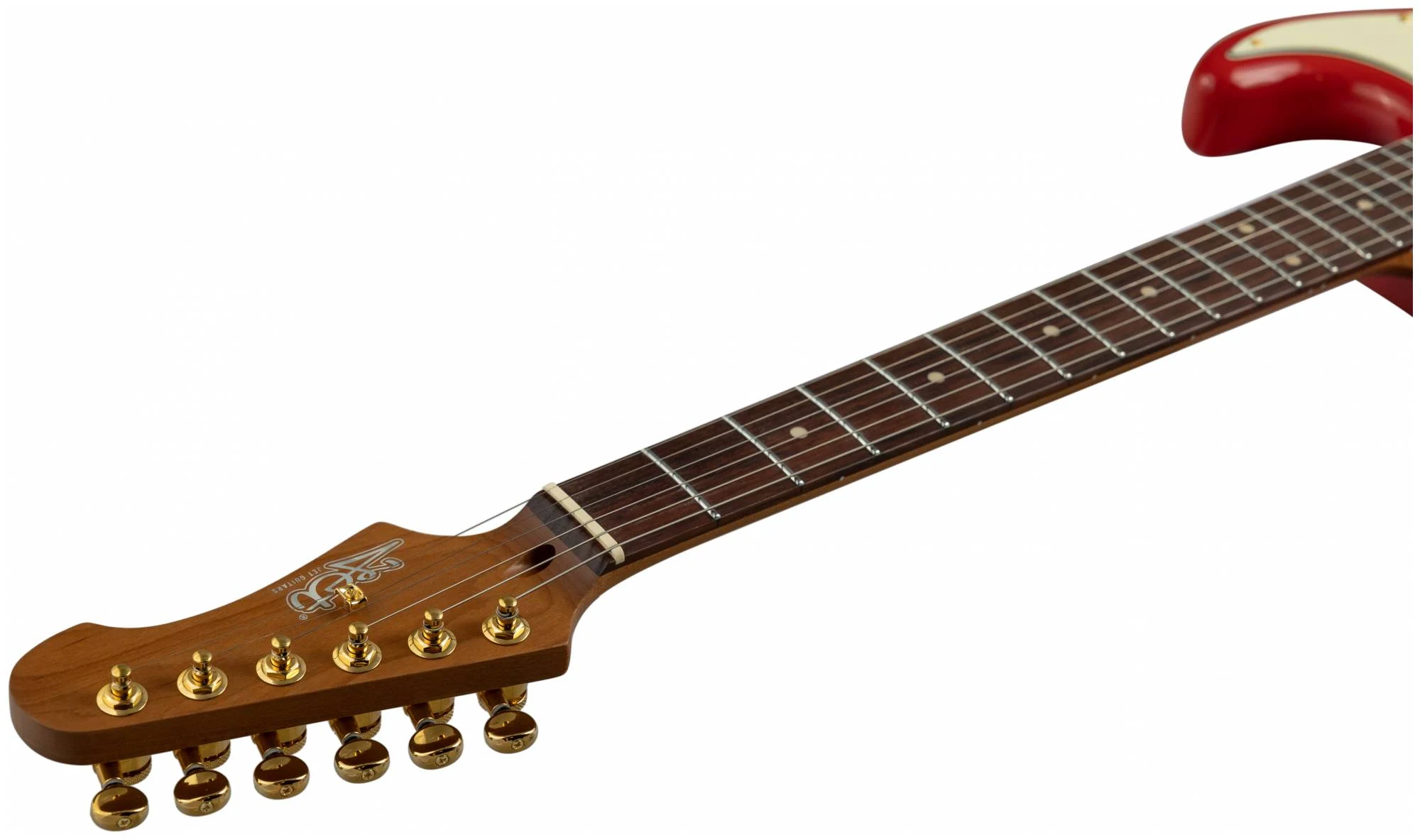 Накладка на гриф выполнена из палисандра с винтажными маркерами Clay Dots, локовые колки, золотая фурнитура и тремоло, звукосниматели SSS Alnico кремового цвета, накладка и ручки управления кремового цвета – в JET JS-380 RD G все продумано до мелочей.