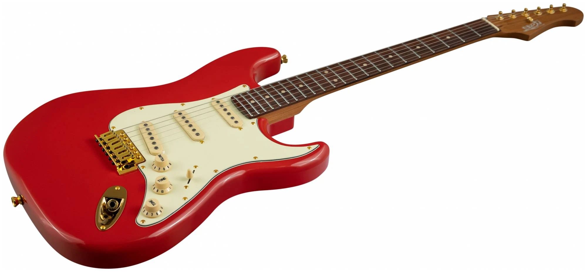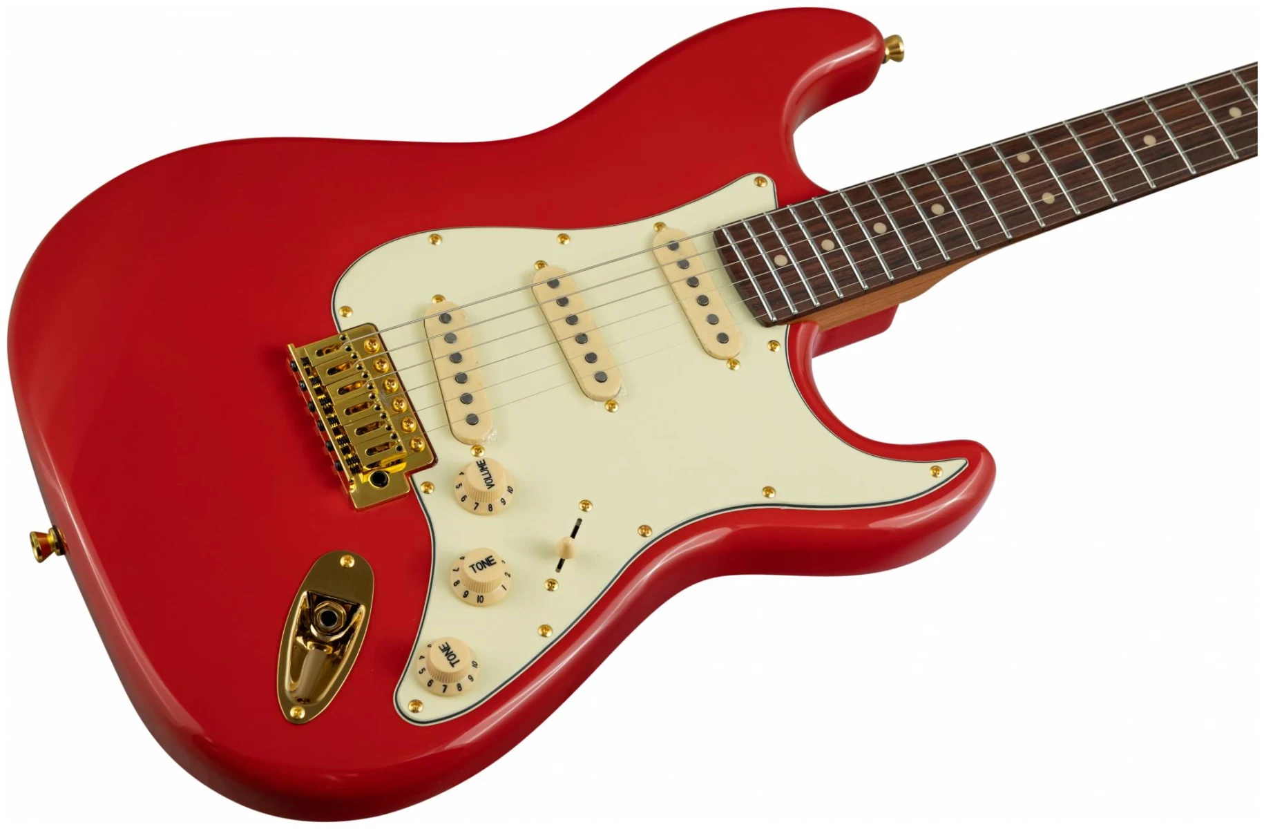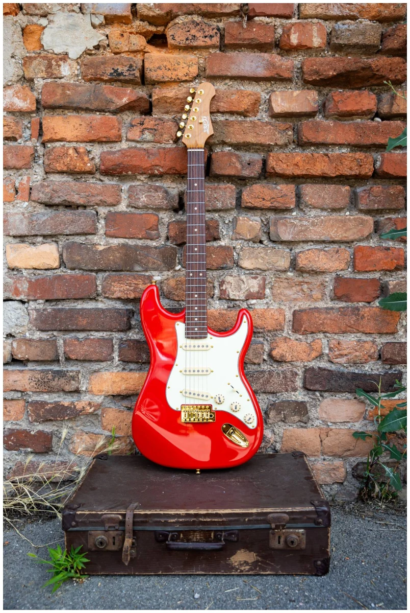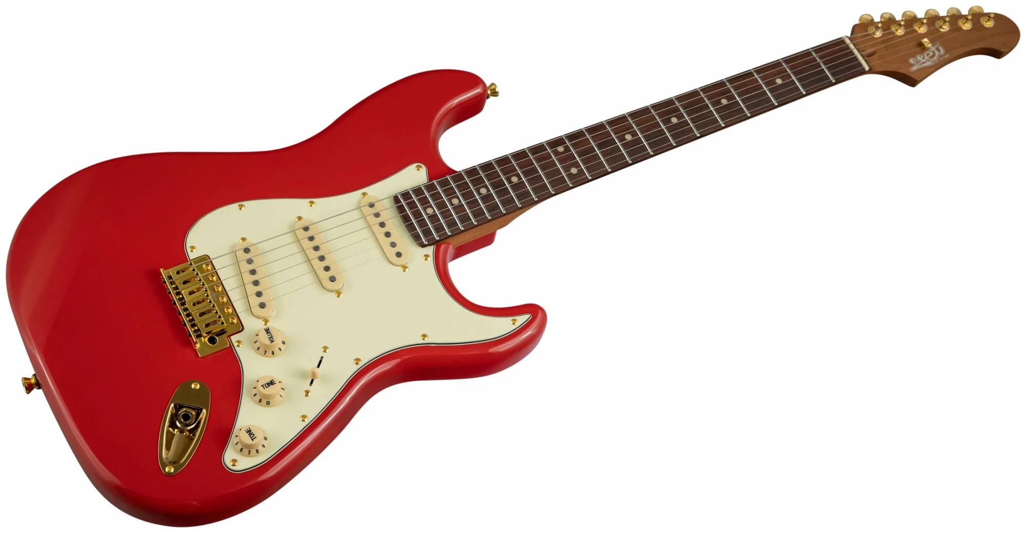 Накладка на гриф выполнена из палисандра с винтажными маркерами Clay Dots, локовые колки, золотая фурнитура и тремоло, звукосниматели SSS Alnico кремового цвета, накладка и ручки управления кремового цвета – в JET JS-380 RD G все продумано до мелочей.