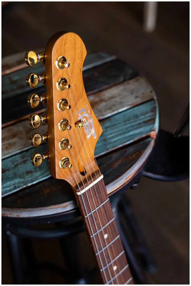Гриф выполнен из канадского печеного клена (roasted maple). При такой обработке поры дерева максимально сжимаются и в процессе использования вода уже не будет выходить, ваша накладка не сожмется и лады не повылазят вне зависимости от влажности и смены температуры. Плюс такое дерево выглядит очень красиво.