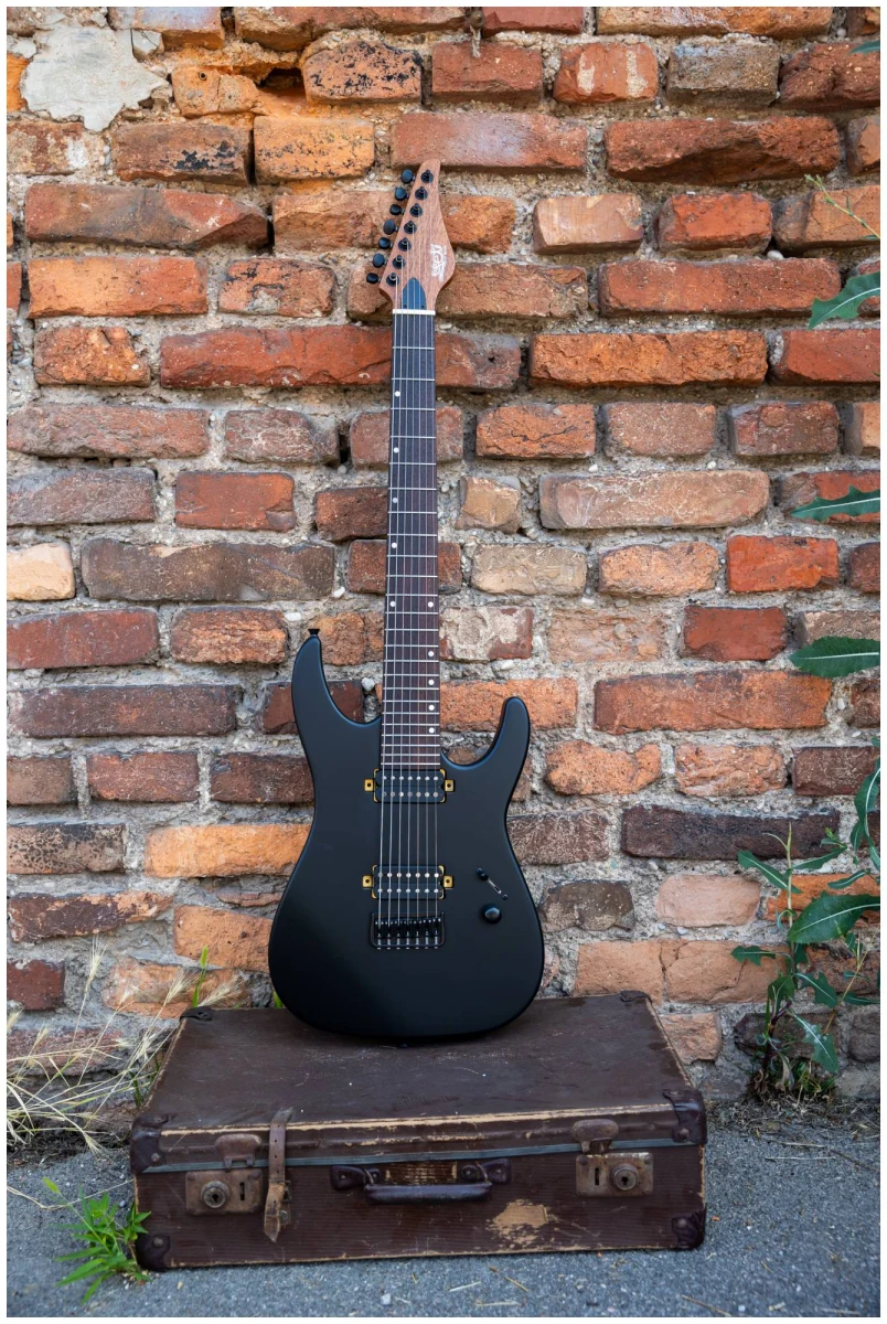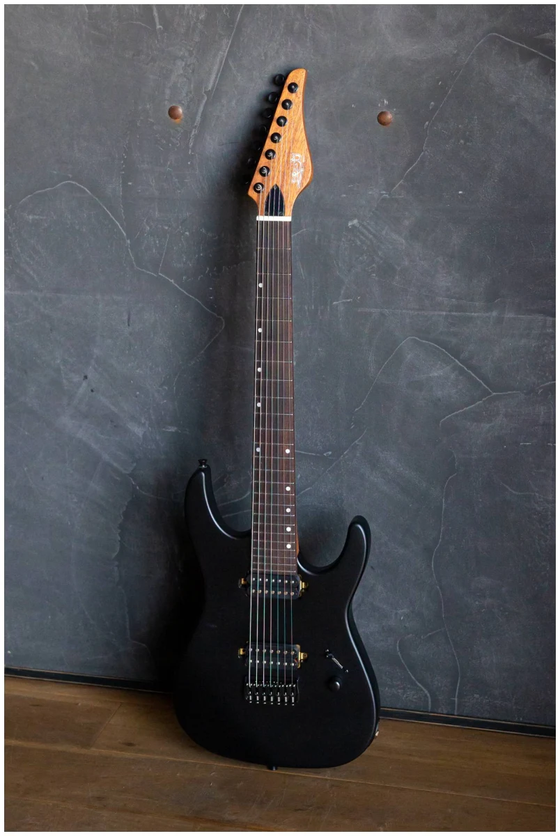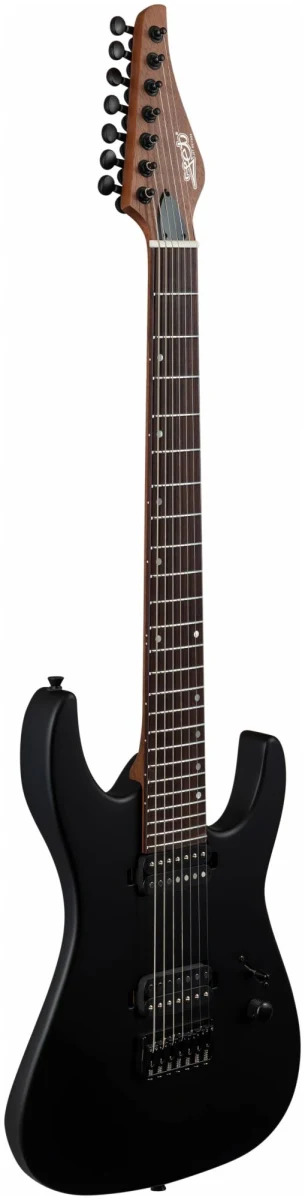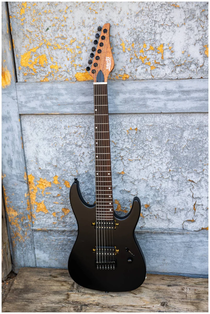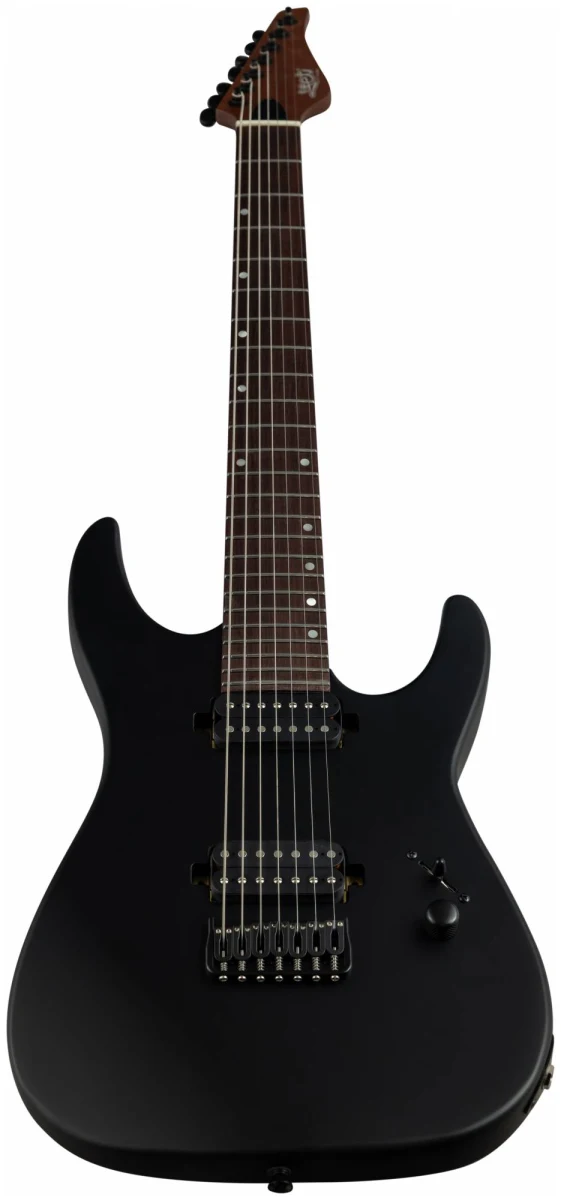 JET JS-507 BK – 7ми струнный инструмент c двумя хамбакерами для тех, кто ищет более тяжелый, жесткий звук. Суперстрат из красного дерева с отделкой черного матового цвета с открытыми порами.