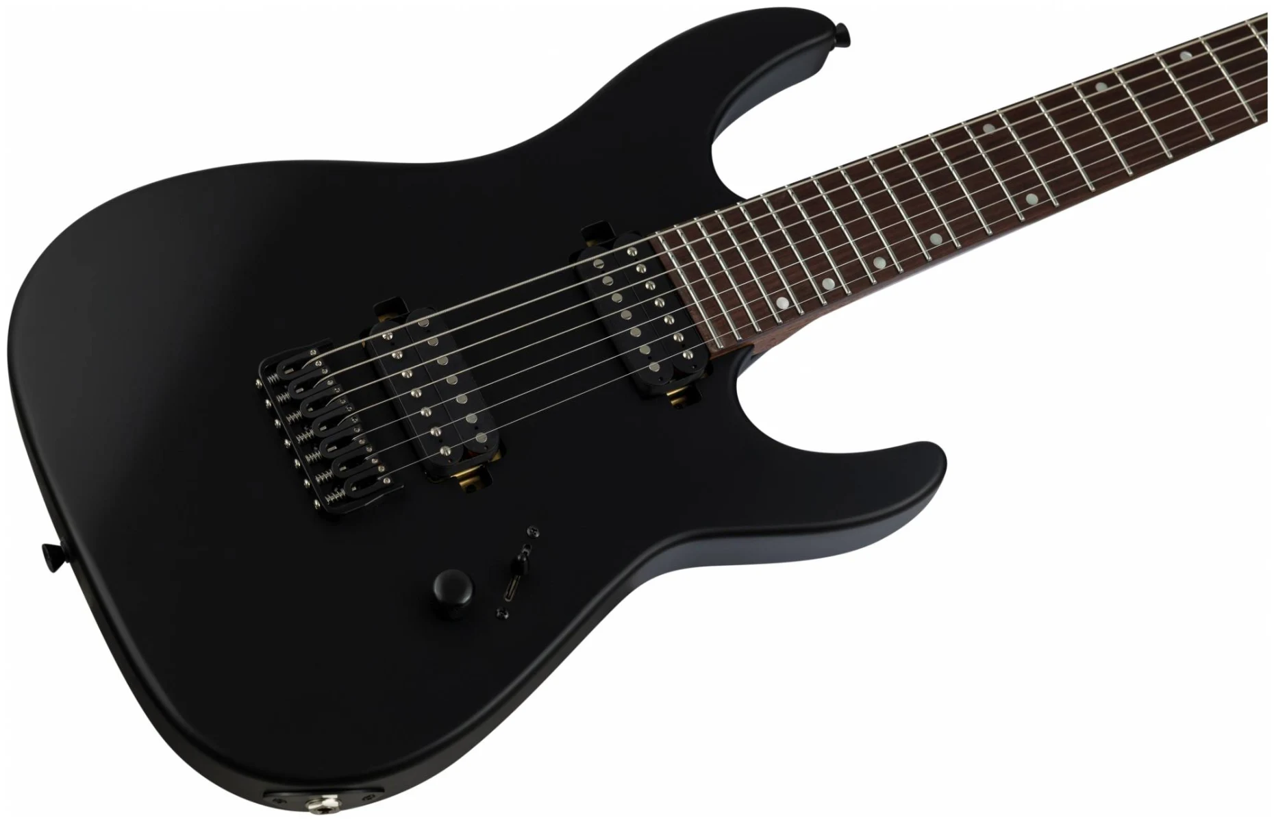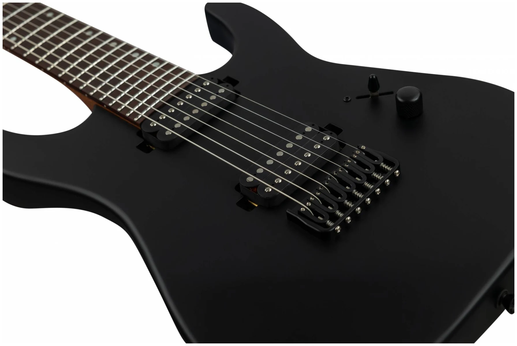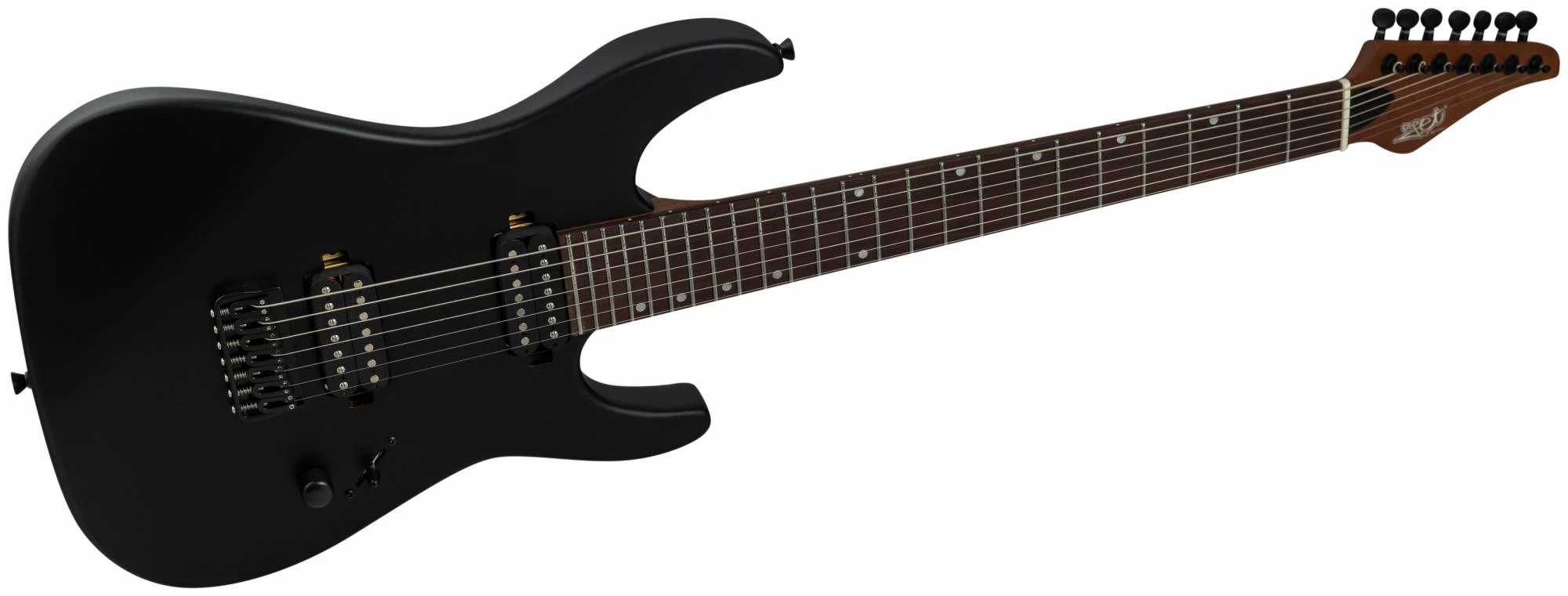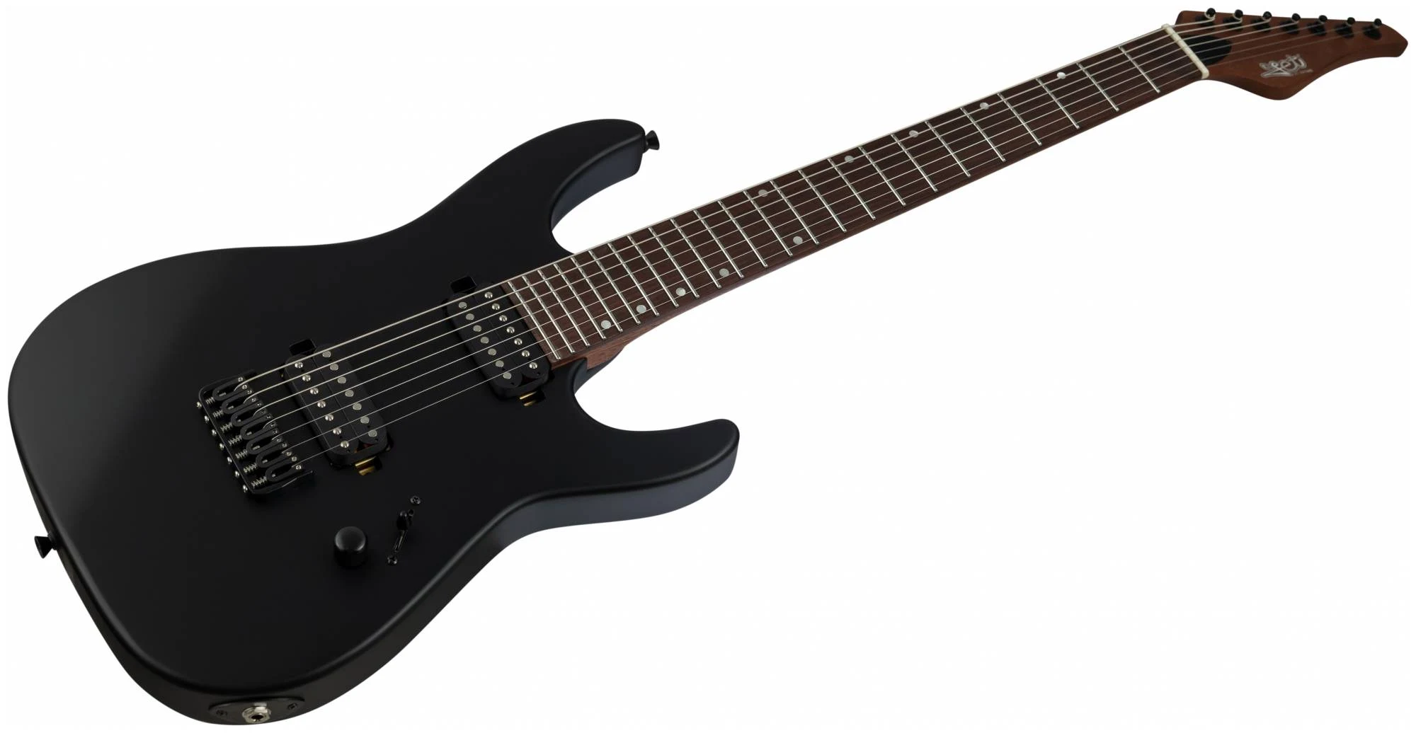 JET JS-507 BK – 7ми струнный инструмент c двумя хамбакерами для тех, кто ищет более тяжелый, жесткий звук. Суперстрат из красного дерева с отделкой черного матового цвета с открытыми порами.
