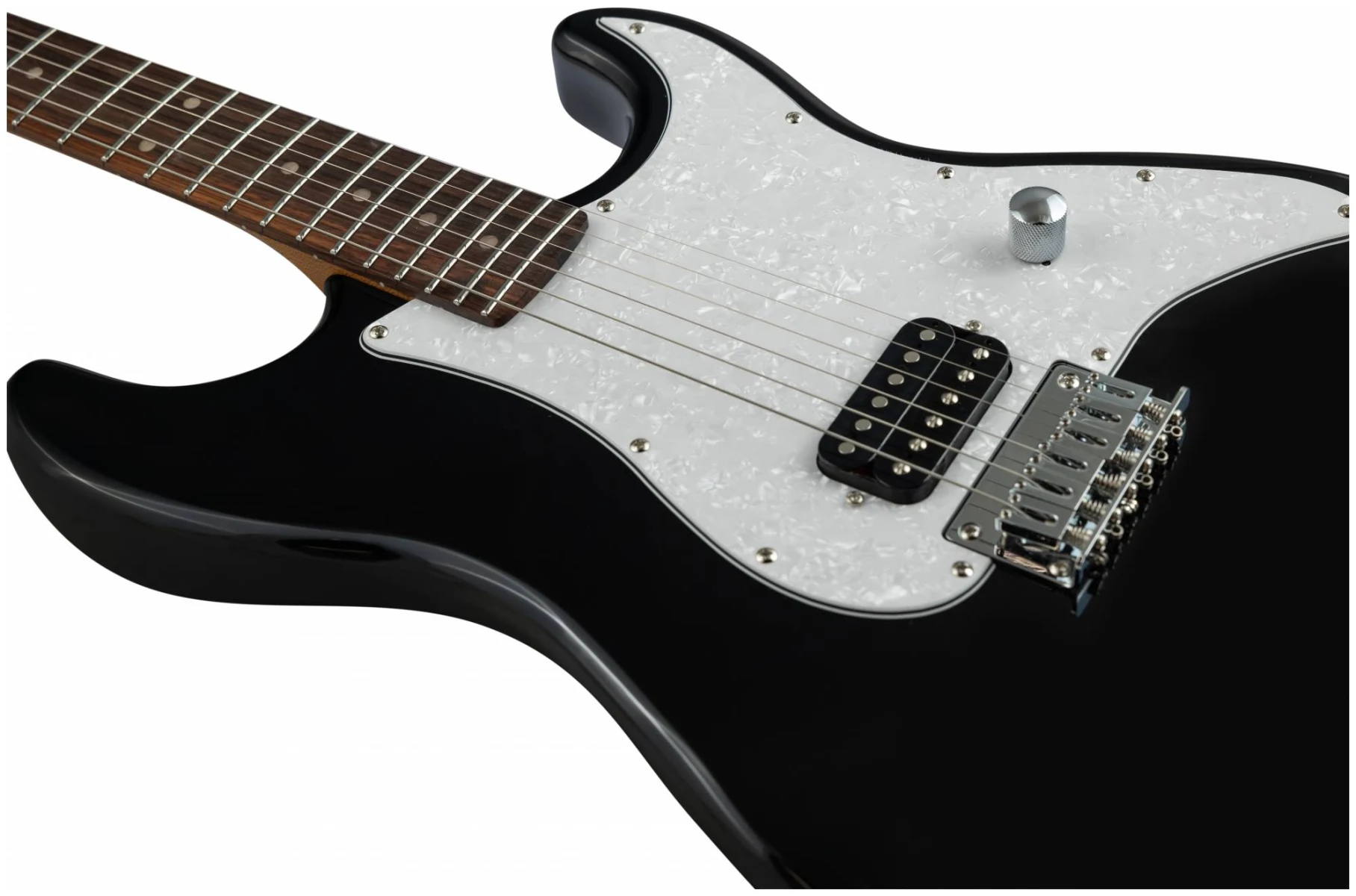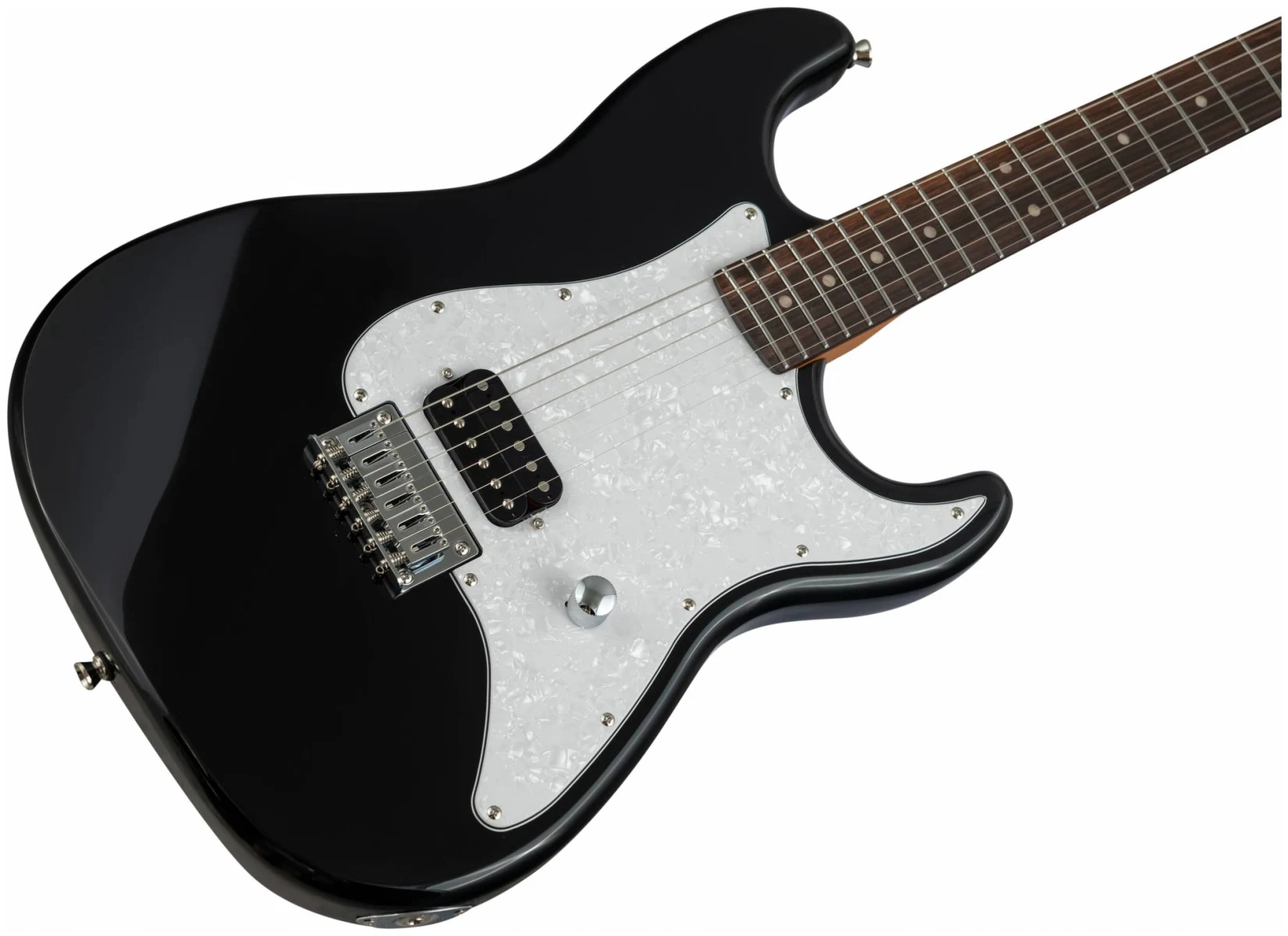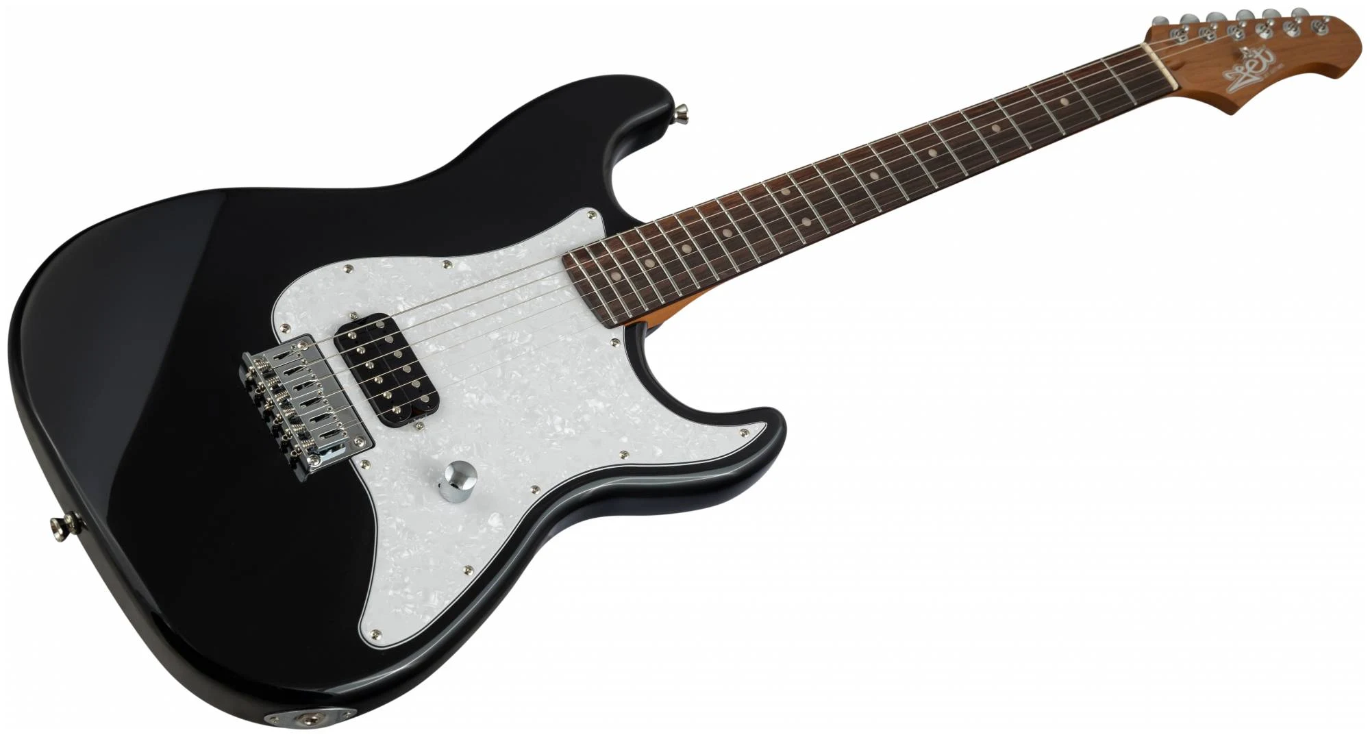 Накладка на гриф выполнена из палисандра, фурнитура хром, фиксированное тремоло, 1 хамбакер черного цвета, перламутровая накладка и металлическая ручка управления – в JET JS-400 HT BK все продумано до мелочей.