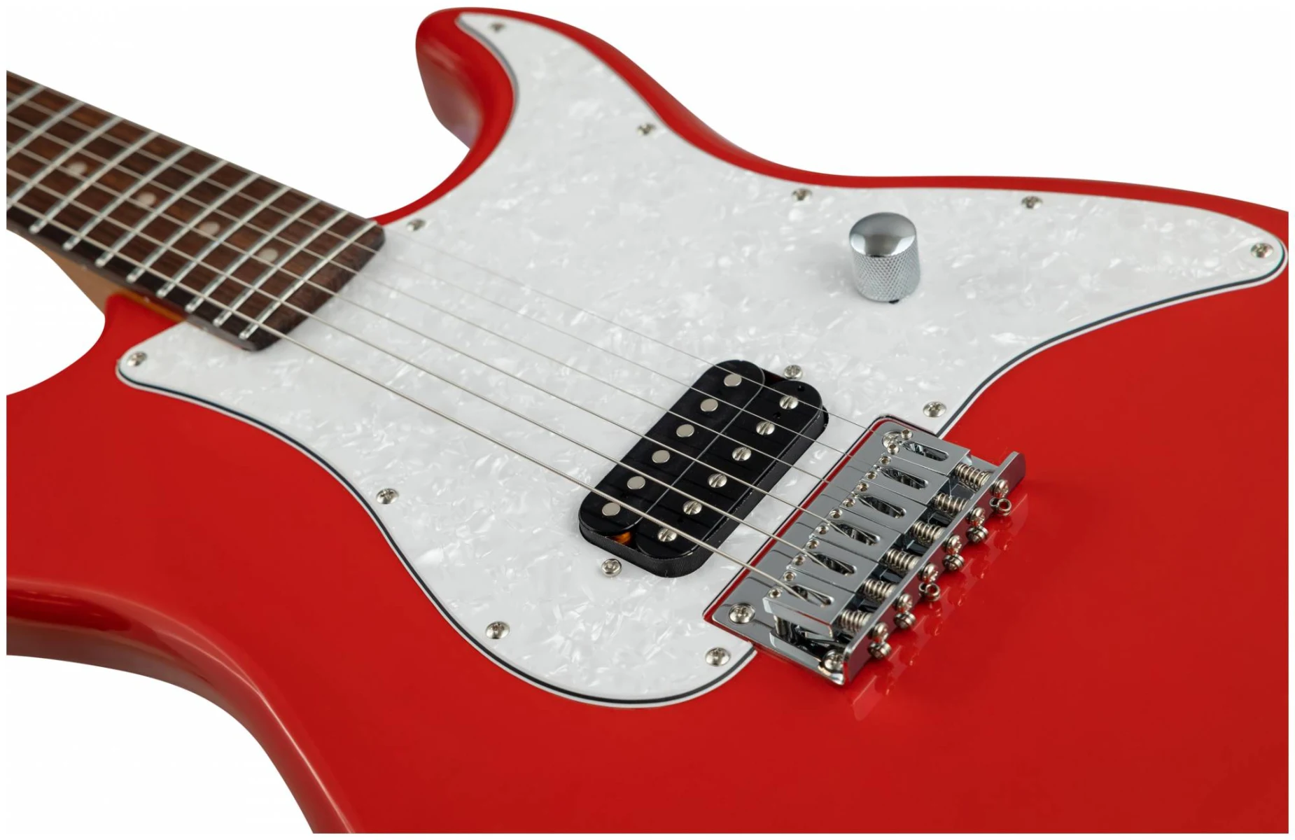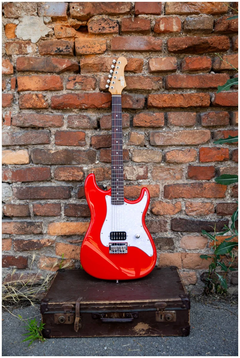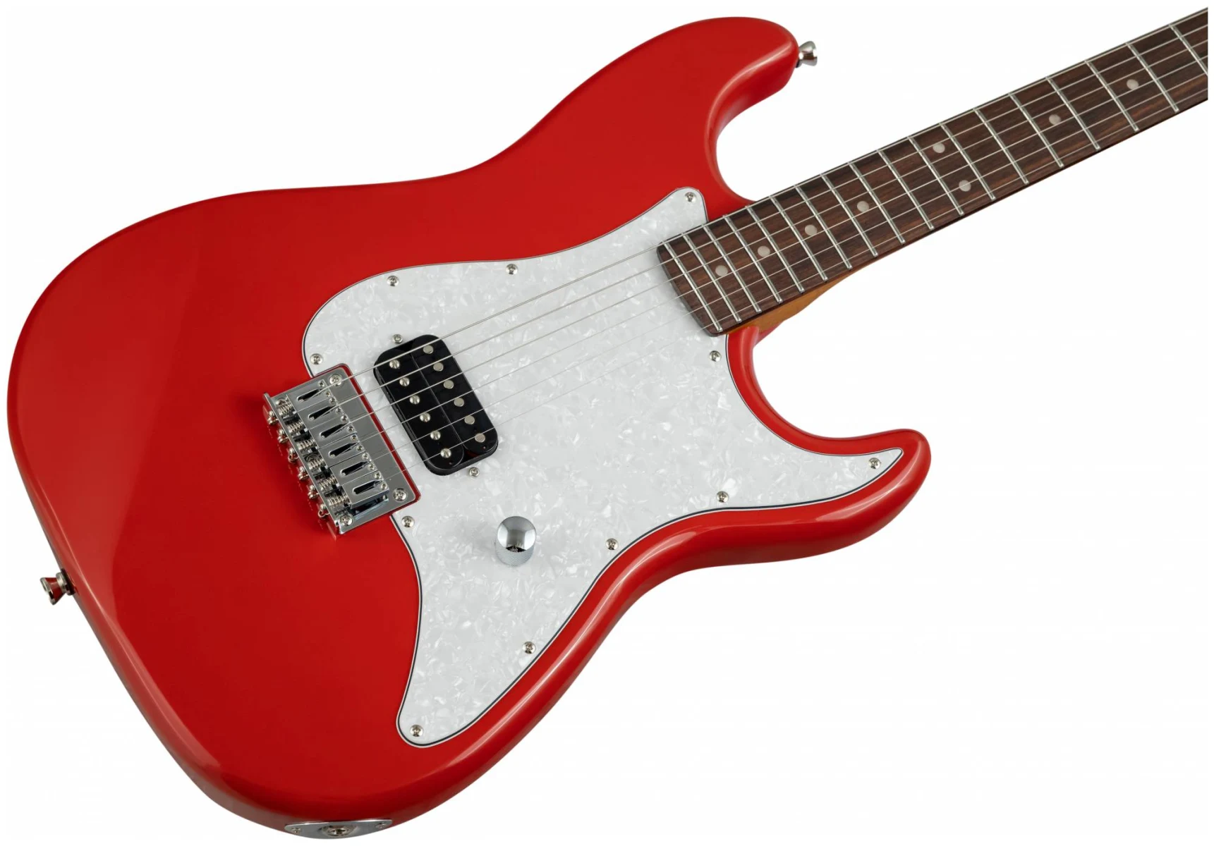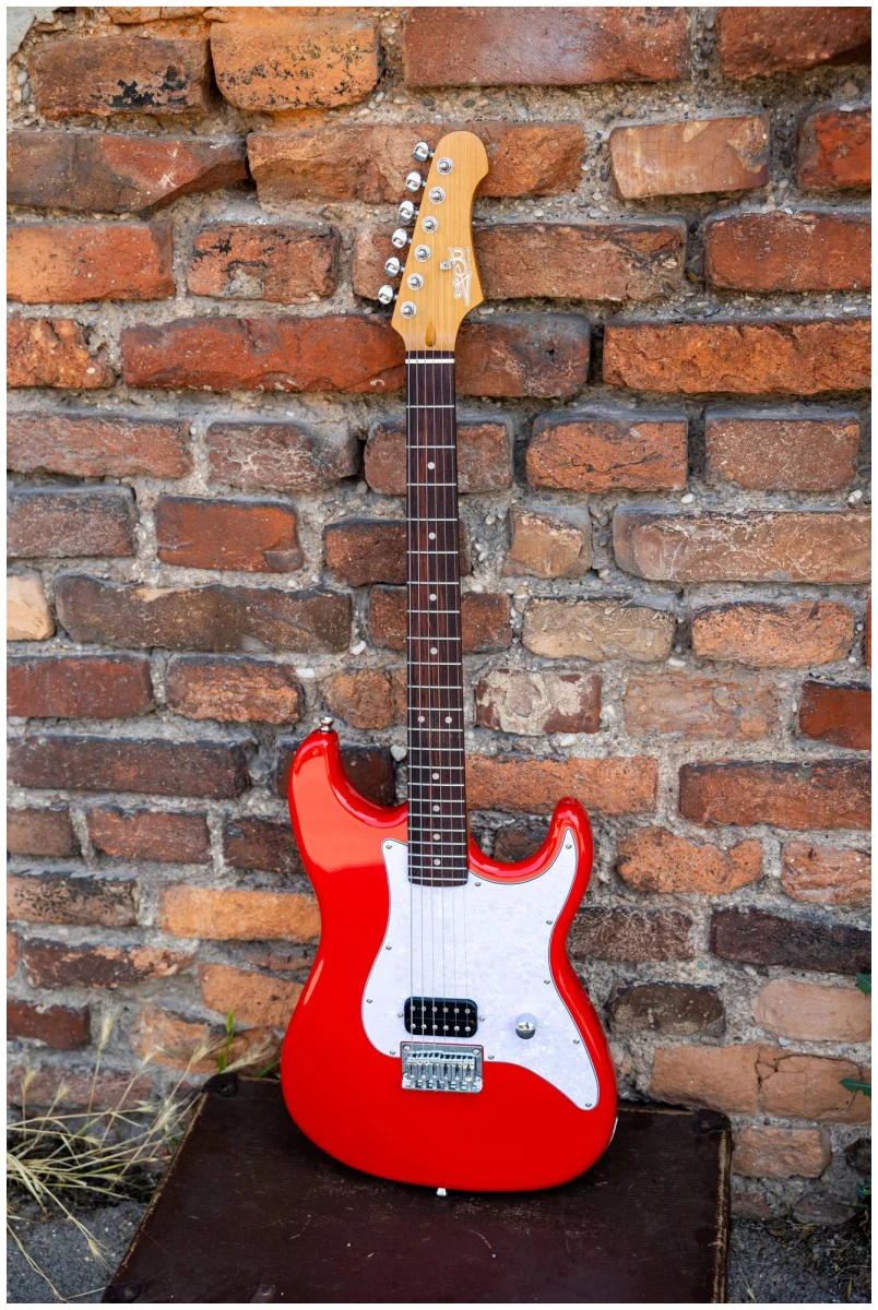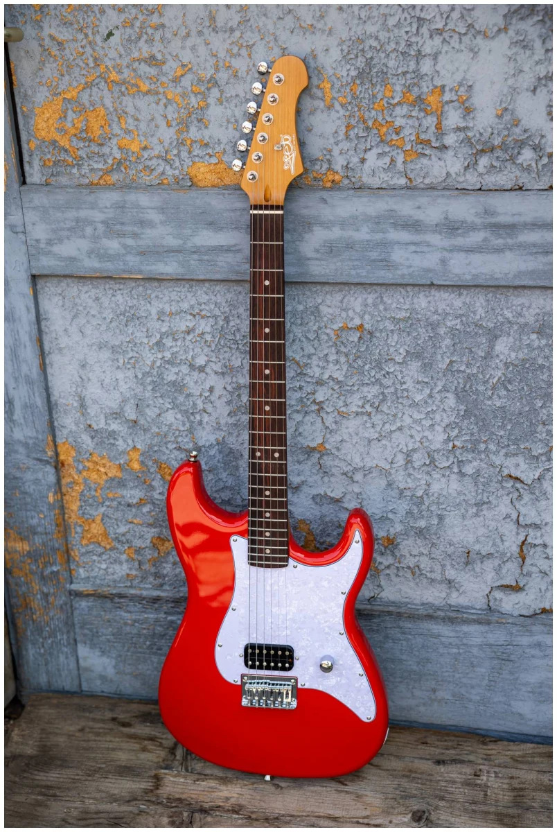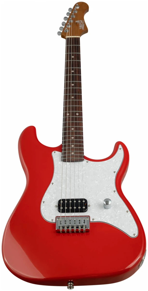 Накладка на гриф выполнена из палисандра, фурнитура хром, фиксированное тремоло, 1 хамбакер черного цвета, перламутровая накладка и металлическая ручка управления – в JET JS-400 HT RD все продумано до мелочей.