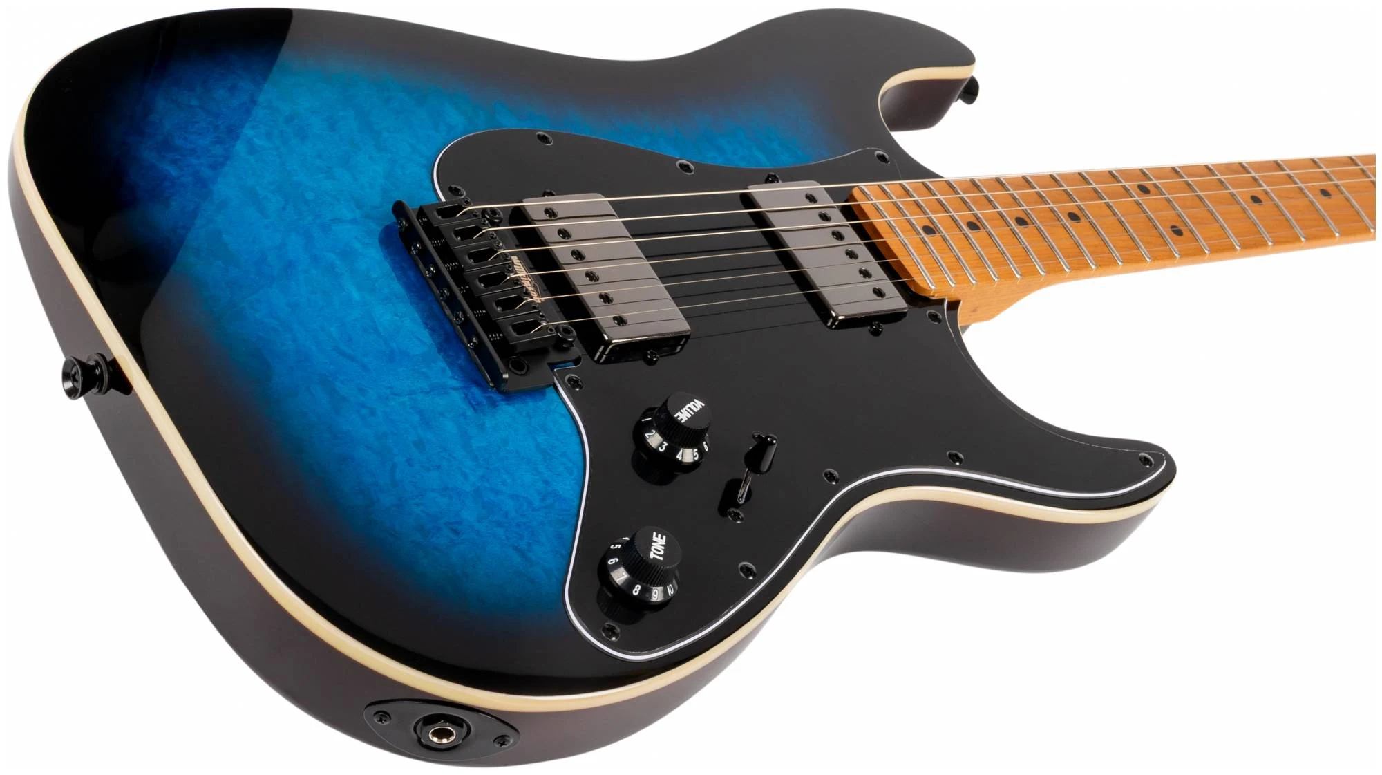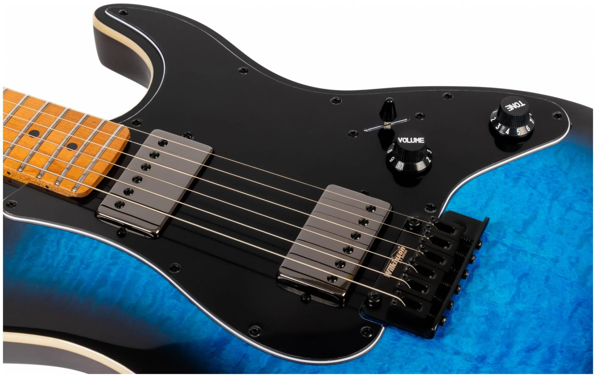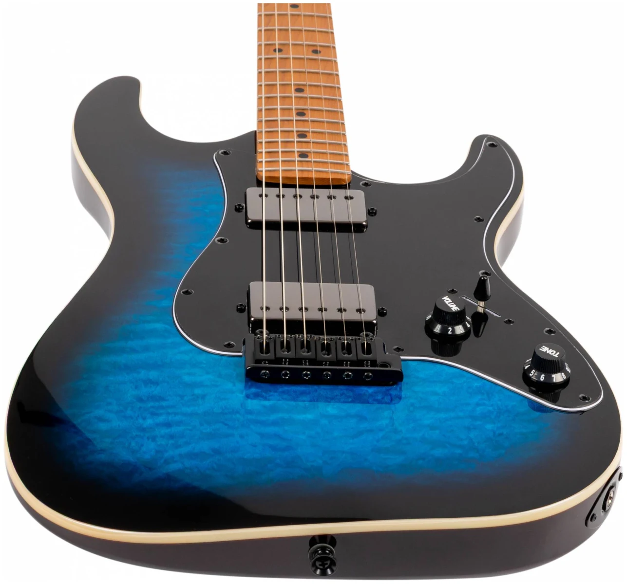 Гриф и накладка на гриф выполнена из печеного клена (roasted maple). При такой обработке поры дерева максимально сжимаются и в процессе использования вода уже не будет выходить, ваша накладка не сожмется и лады не повылазят вне зависимости от влажности и смены температуры. Плюс такое дерево выглядит очень красиво.