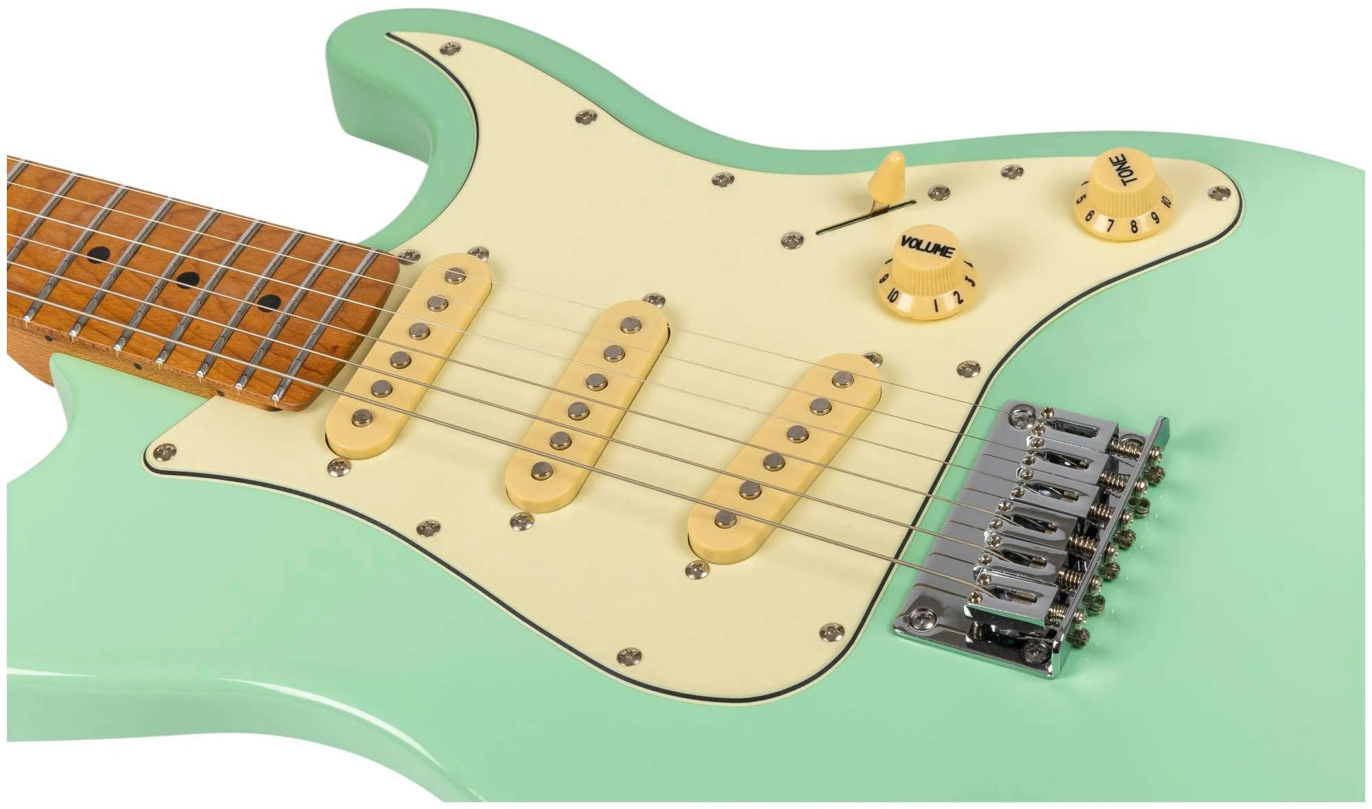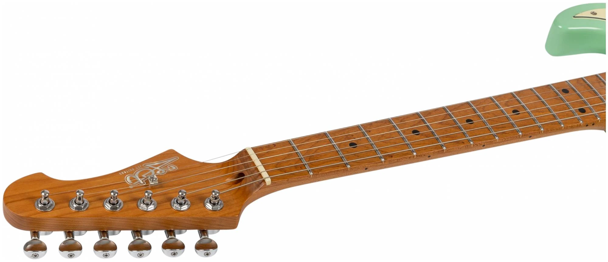 Гриф и накладка на гриф выполнены из печеного клена (roasted maple). При такой обработке поры дерева максимально сжимаются и в процессе использования вода уже не будет выходить, ваша накладка не сожмется и лады не повылазят вне зависимости от влажности и смены температуры. Плюс такое дерево выглядит очень красиво.