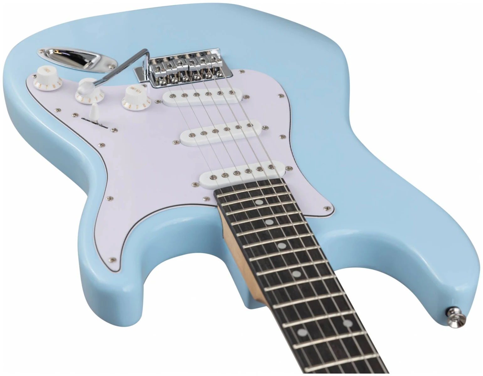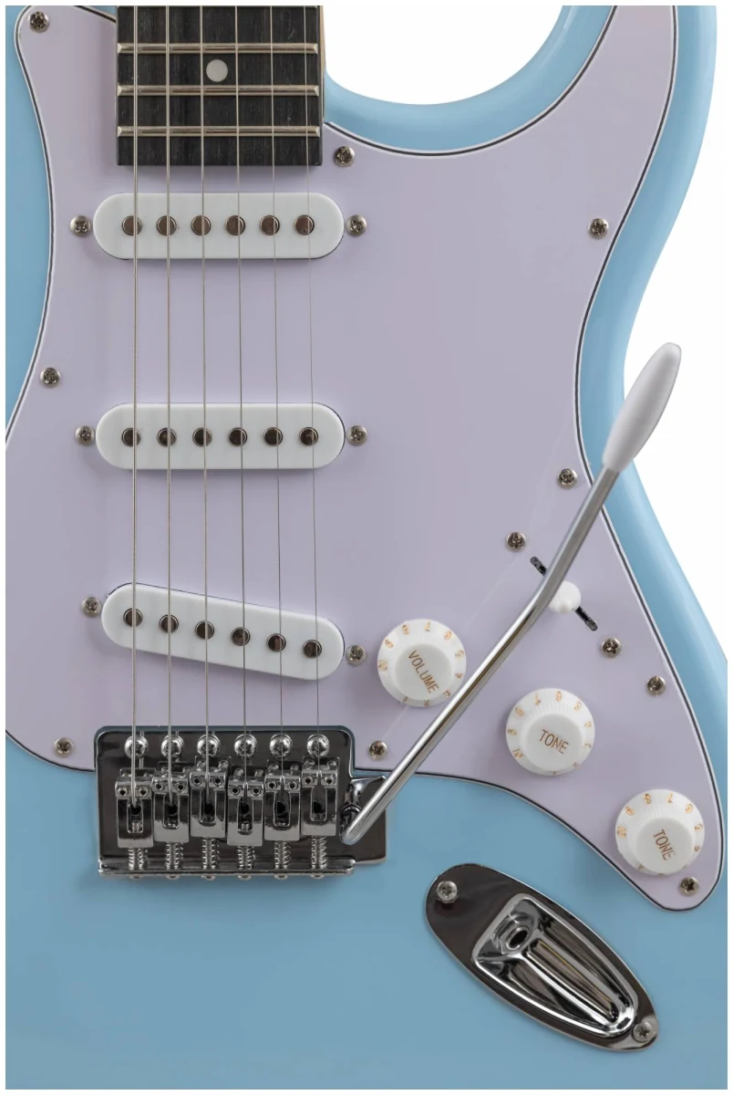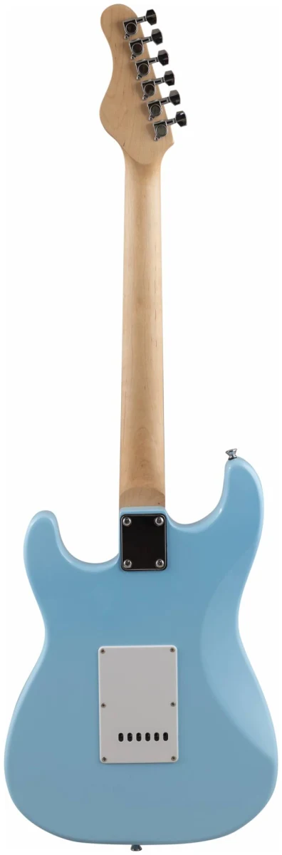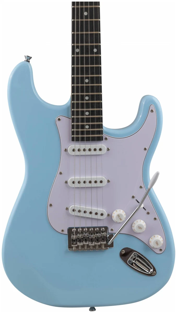 Электрогитара имеет стильный и легко узнаваемый дизайн в стиле Stratocaster, который подойдет для игры в любом жанре. Корпус гитары сделан из тополя, что обеспечивает стабильность инструмента. Гриф из клена и накладка из техновуда обеспечивают комфортную игру на электрогитаре в течение долгого времени. Конфигурация звукоснимателей: три звукоснимателя сингл(ceramic). Электроника: 1 регулятор громкости и 2 тона, 5-позиционный переключатель. Бридж: тремоло 6 болтов. Лады: 22 шт, 2.7. Мензура: 648 mm/25.5". Анкер двойного действия. Хромированная колковая механика. Колки расположены в один ряд.