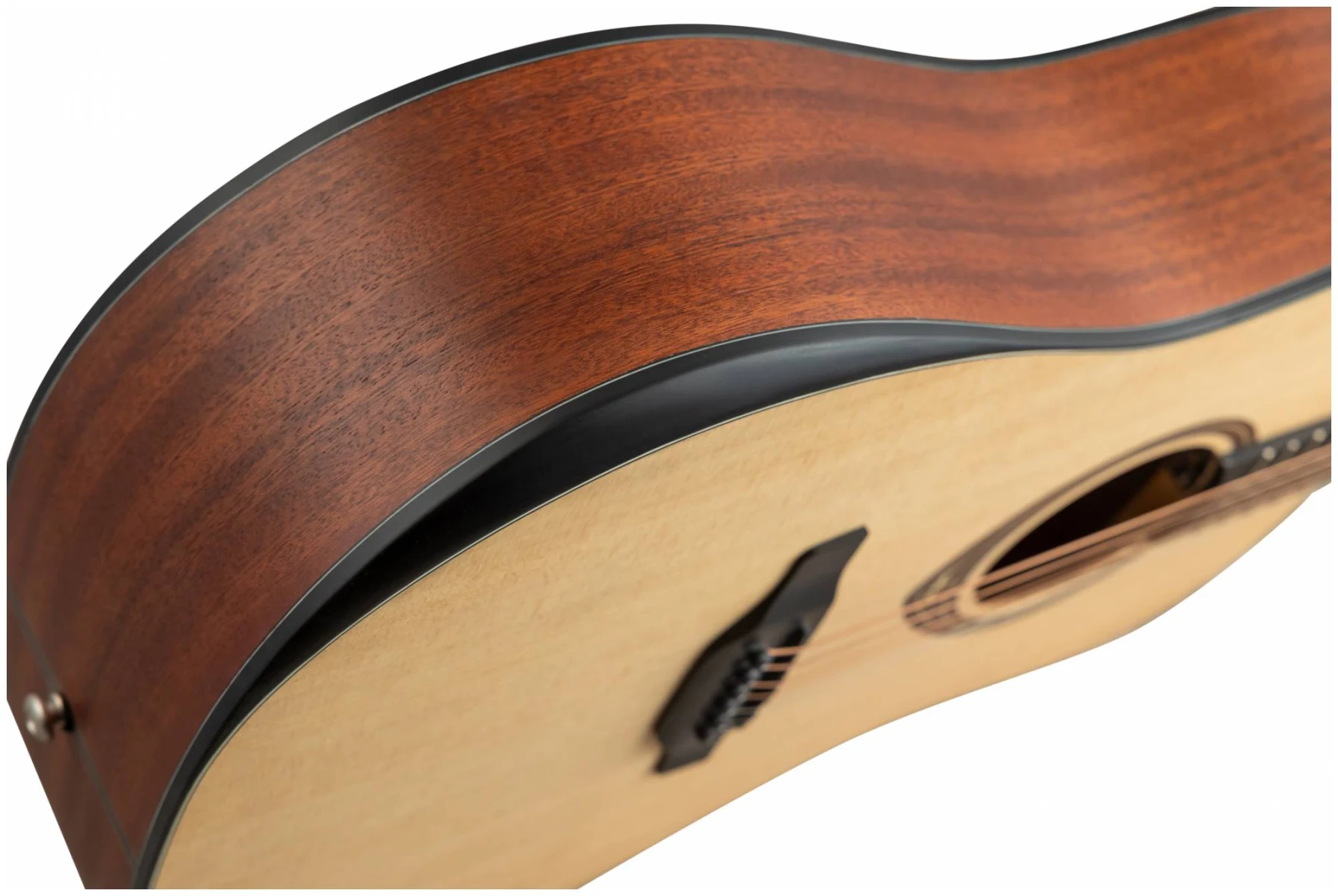 Верхняя дека выполнена из массива ситхинской ели – эта порода древесины особенно ценится в производстве музыкальных инструментов за её однородную структуру, которая обеспечивает хороший резонанс и глубокий, прозрачный звук. Корпус сделан из сапеле. Тонкий матовый лак позволяет дереву лучше «дышать» и раскрывает все нюансы и естественную красоту звучания инструмента.