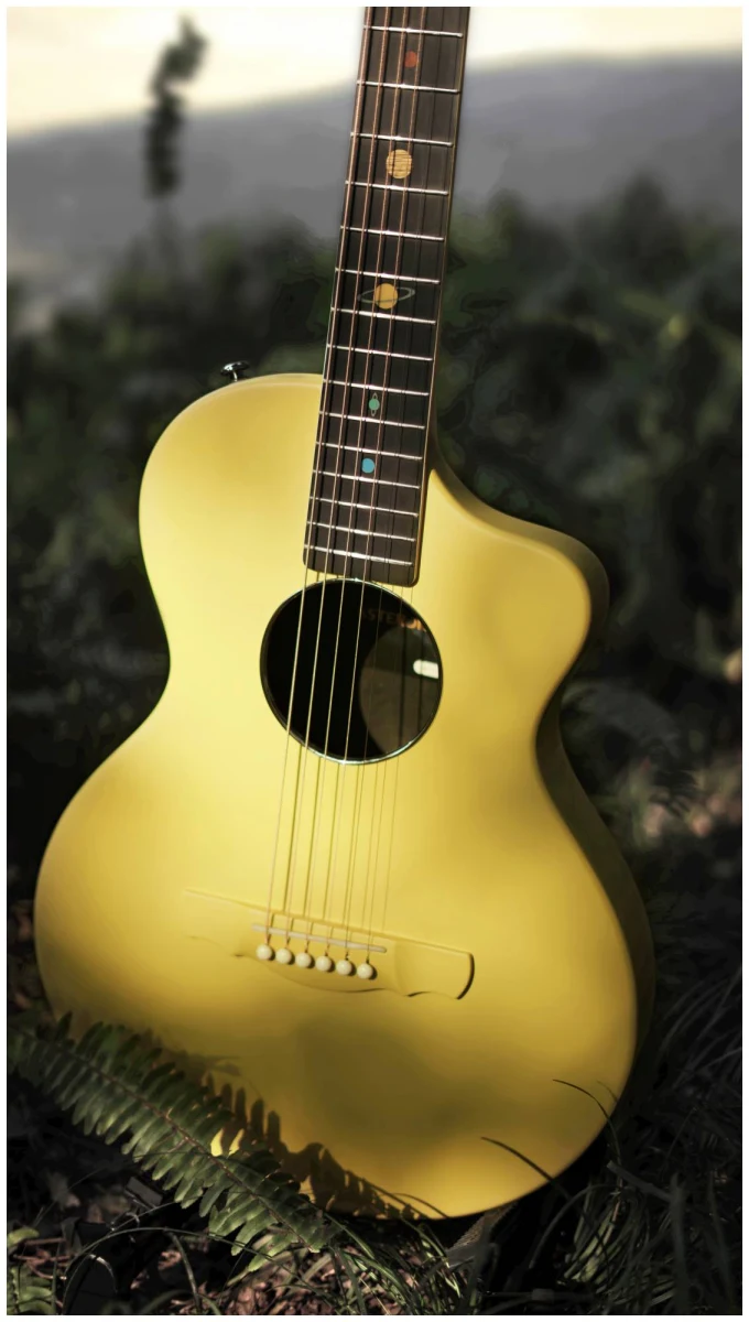 Эта гитара про прочность, стиль и исключительный звук. Инструменты серии Asteroid изготовлены полностью из корбонового композита, что считается прочнее и долговечнее дерева. Оно не подвержено деформации при различных скачках температуры и не портится со временем. Именно эти характеристики и легкий вес позволяют гитарам быть идеальным вариантом для любых путешествий: будь это снежные горы, пляжи или даже пустыни.