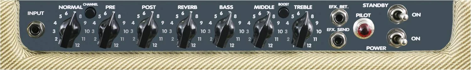 Панель управления расположена сверху, на красивом хромированном шасси. Ручки управления выполнены опять‑таки в vintage-стиле, «клювиками» – напоминают немного ручки от газовой плиты. Комбо имеет 2 канала: чистый и overdrive.