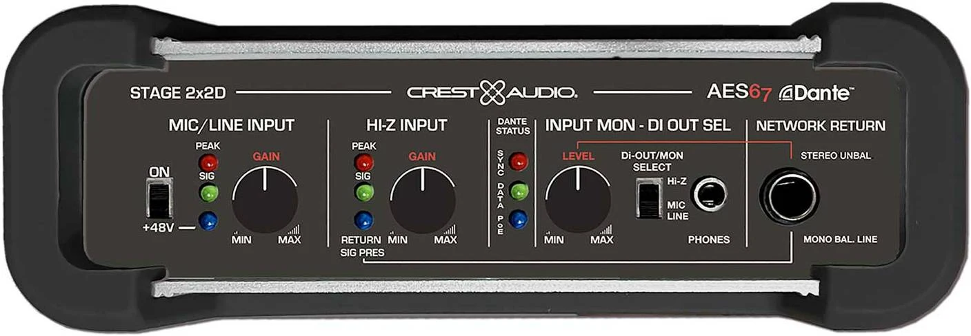 Crest Audio® Stage™ 2x2D — это интерфейс Dante®/AES67 с питанием от сети PoE, поддерживающий профессиональный аудио‑аналоговый/цифро‑аналоговый интерфейс — малошумящий микрофонный/линейный предусилитель с прямым вводом (DI).